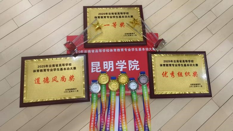 10月31日至11月3日,由云南省教育厅主办,云南省学校体育教学指导委员会、红河州教育体育局、红河学院承办的2025年云南省高等学校体育教育专业学生基本功大赛在红河学院举行,来自全省20所本科高校的代表队同台竞技。经过激烈角逐,昆明学院代表队凭借过硬的专业素养和出色的综合表现,荣获“团体一等奖”(团体总分第三名),同时获“优秀组织奖”“体育道德风尚奖”;两位指导教师荣获“优秀教练员”;6名参赛学生中,3人获一等奖、2人获二等奖、1人获三等奖,全面展现了我校体育教育专业学子的专业水平。
