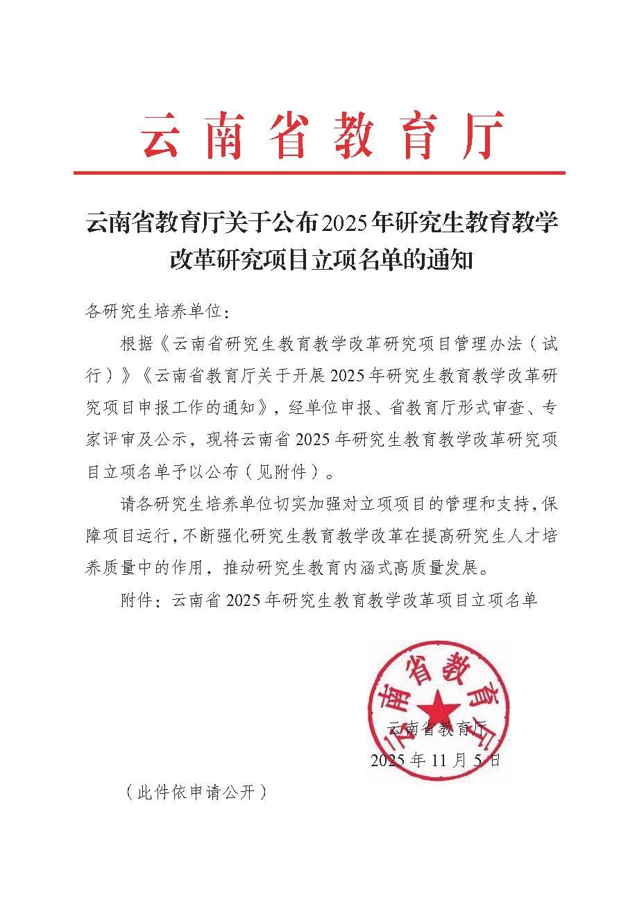 根据《云南省研究生教育教学改革研究项目管理办法(试行)》《云南省教育厅关于开展2025年研究生教育教学改革研究项目申报工作的通知》,经单位申报、省教育厅形式审查、专家评审及公示,体育学院王玉洪教授获得立项建设。