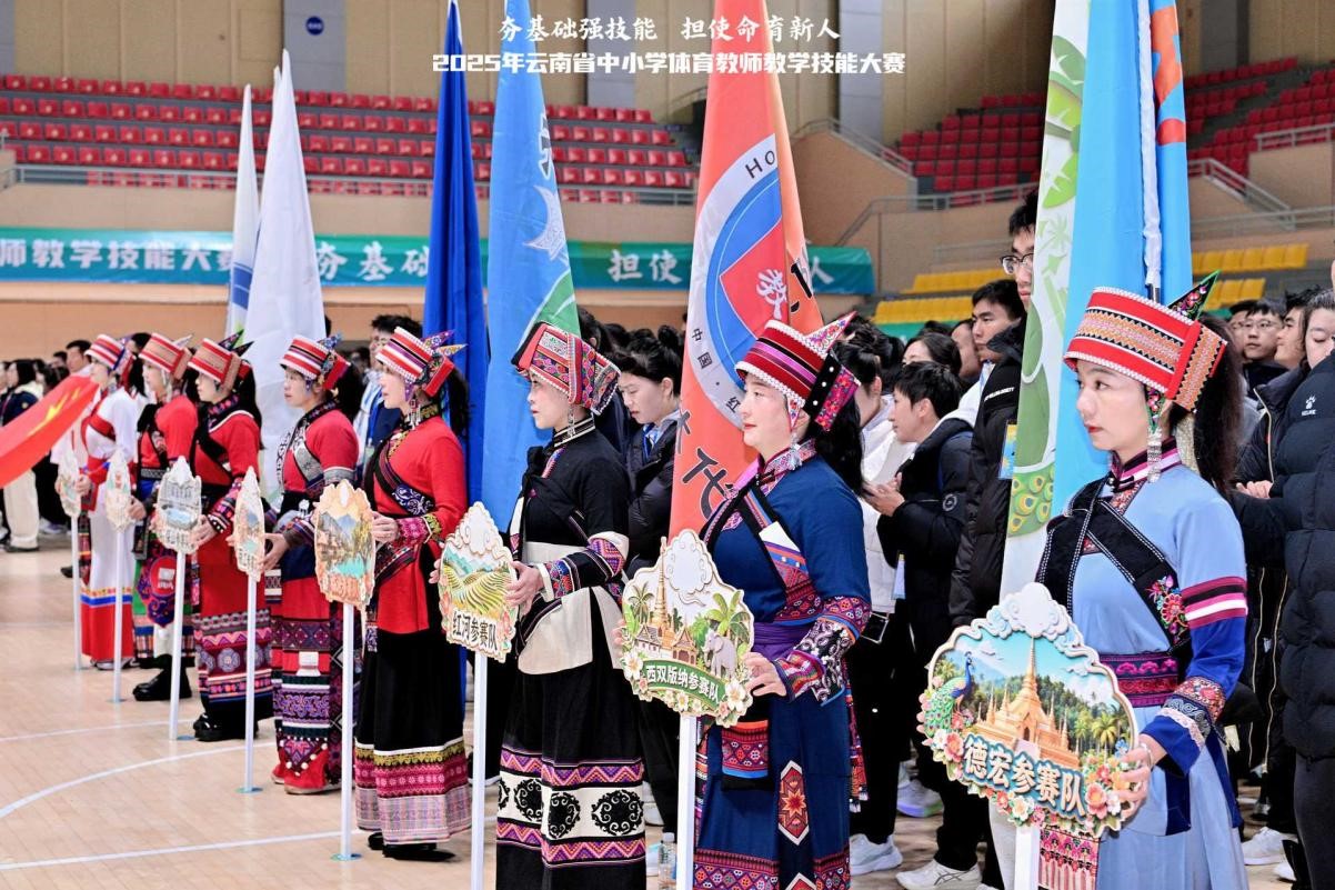 近日,2025年云南省中小学体育教师教学技能大赛在石林县体育馆隆重拉开帷幕。本次大赛由云南省教育厅主办,云南省学校体育教学指导委员会、昆明市教育体育局、石林彝族自治县人民政府承办,吸引了全省16个州市的252名体育教师同台竞技。昆明学院体育学院凭借深厚的专业积淀和良好的行业声誉,受邀承担本次大赛裁判工作,派出由王玉洪教授、周明教授、余少东老师等组成的专业裁判团队履职,助力赛事公平公正有序开展。