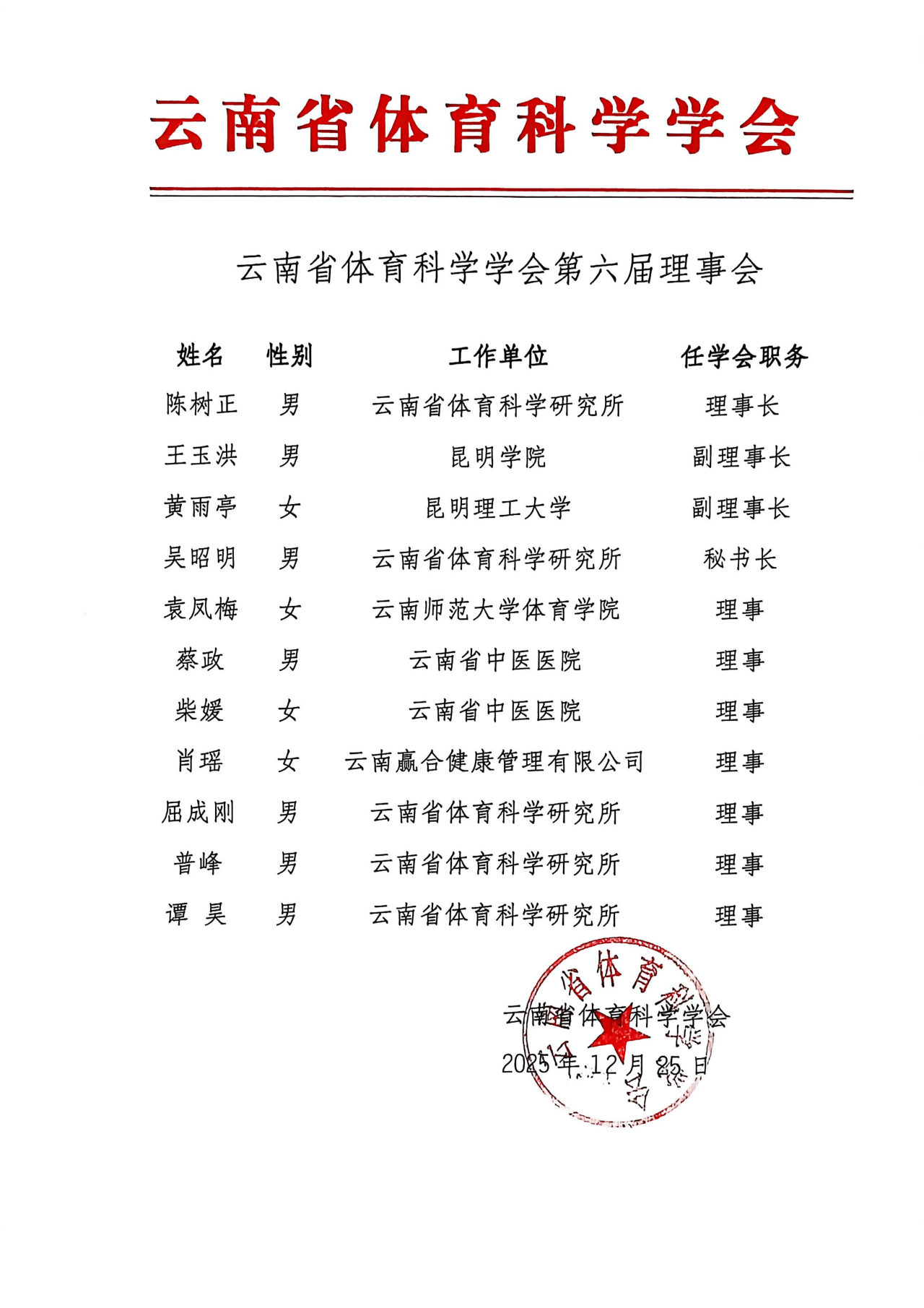 2025年12月25日,云南省体育科学学会换届大会在云南省体育科学研究所召开。会议严格遵循既定议程,圆满完成各项换届任务,为学会未来发展注入新的活力。省科协、省民政厅相关领导,学会第五届理事会成员及会员代表出席会议。会议由学会第五届理事会副秘书长白旭宇主持。