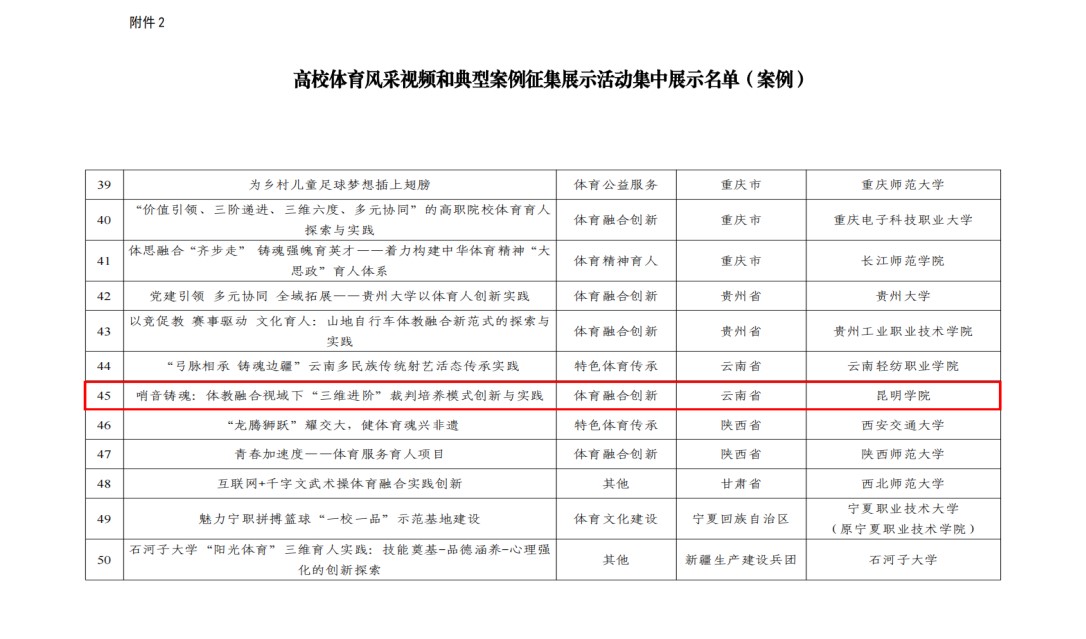 此次入选,既是对我校体育育人工作的充分肯定,也是对体育学院师生持续探索体教融合路径的积极鼓舞。值得一提的,云南省仅有两项案例入选全国展示,我校案例位列其中。该作品聚焦体教融合创新课程体系,系统呈现了我校在体育课程改革与体育精神育人方面的深入探索和阶段性成果,生动展现了昆院师生积极向上、拼搏进取的精神风貌。